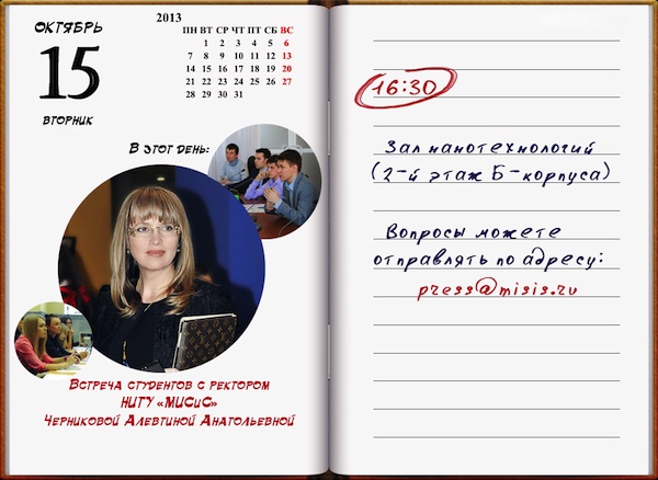 16-30 Нанотехнологий состоится встреча ректора НИТУ «МИСиС» Черниковой Алевтины Анатольевны со студентами. Вопросы можно отправлять на