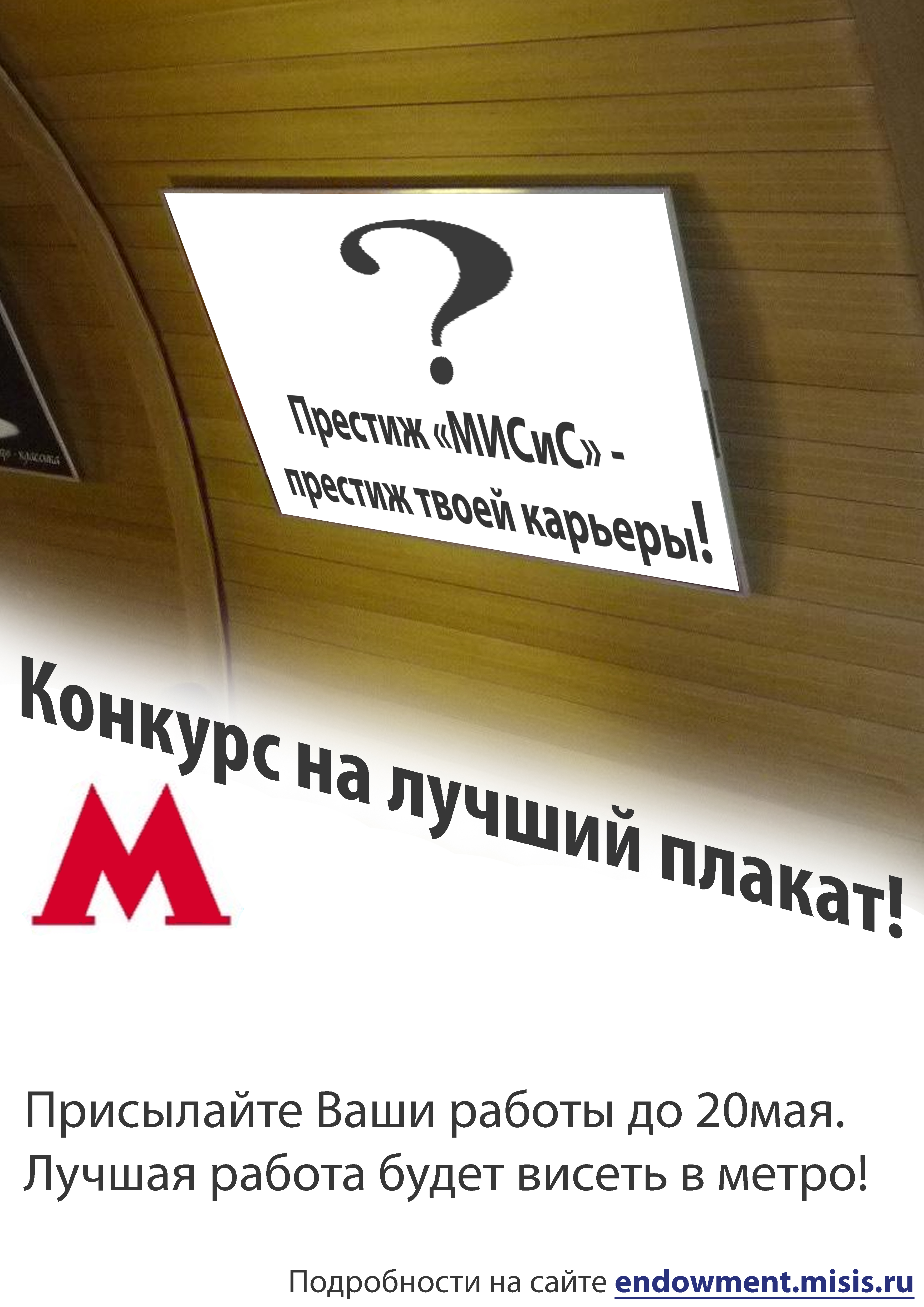 Участникам конкурса предлагается создать плакат с лозунгом «Престиж „МИСиС“ — престиж твоей карьеры!» Лучший плакат будет висеть на стенде в метро «Октябрьская» (кольцевая линия).