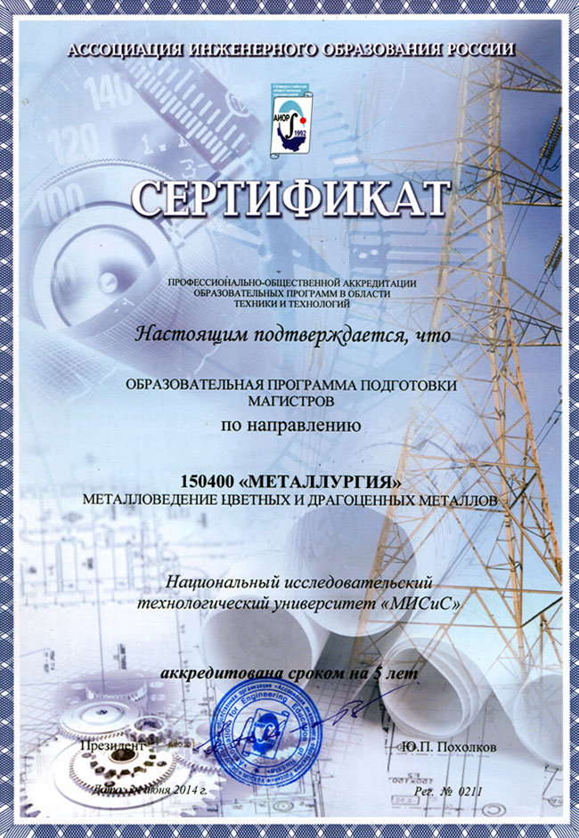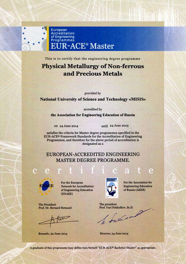Образовательная программа подготовки магистров «Металловедение цветных и драгоценных металлов» (по направлению «Металлургия») аккредитована в Ассоциации Инженерного Образования России (АИОР) с выдачей Сертификатов АИОР о прохождении общественно-профессиональной аккредитации и Сертификатов Европейской сети по аккредитации в области инженерного образования (ENAEE) о присвоении «Европейского знака качества» (EUR-ACE® Master).