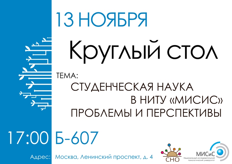 13 ноября в 17:00 в аудитории Б-607 состоится Круглый стол на тему: «Студенческая наука в НИТУ „МИСиС“. Проблемы и перспективы.» Приглашаются все желающие.