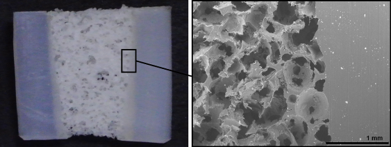 Рисунок 2 — Фотография сечения биоинженерной конструкции на основе СВМПЭ и её увеличенная часть с помощью СЭМ