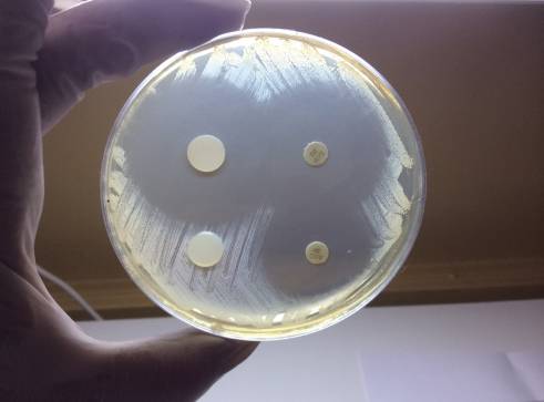 Рисунок 4 — Учет результатов задержки колониеобразования бактерий вокруг экспериментального образца сплошного армирующего слоя с покрытием, контрольного (без покрытия) и стандартизированного диска) в проходящем свете