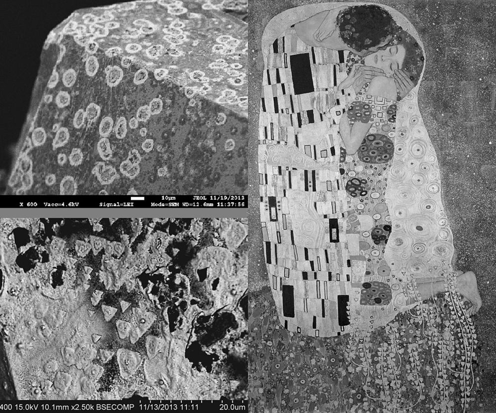 Полученные узоры напоминают не только мозаичную технику Густава Климта, но и создают ассоциацию с сюжетом картины «Поцелуй», на которой мужчина бережно обнимает женщину, укрывая ее от внешнего мира. Фотографии получены с помощью сканирующих электронных микроскопов JSM-7600F (JEOL, Япония) и Hitachi S-3400N (Япония).