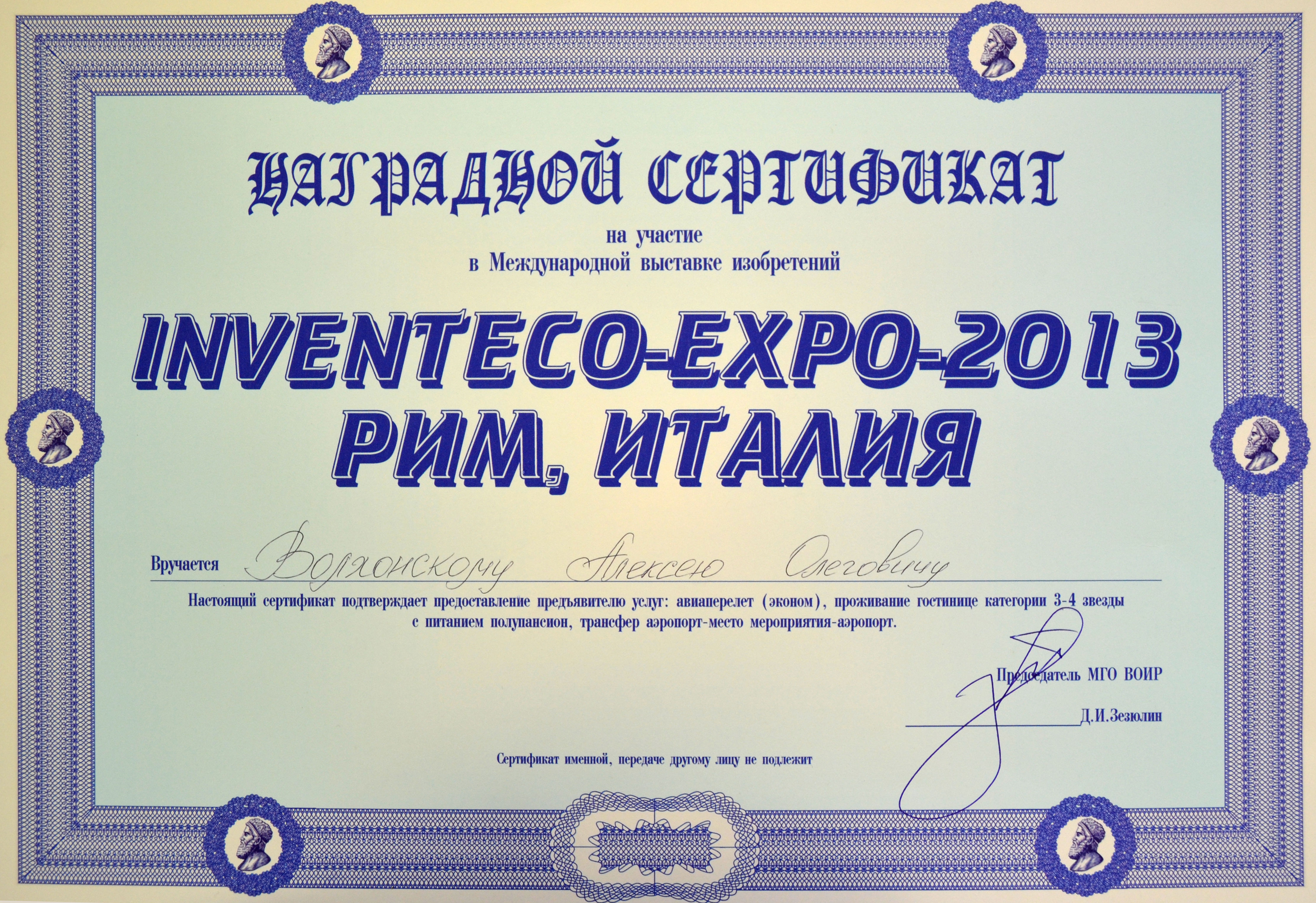 • Волхонский Алексей Олегович, инженер кафедры функциональных наносистем и высокотемпературных материалов, с проектом «Разработка наноструктурных покрытий для режущего осевого твердосплавного инструмента расширенной области применения», награжденный Гран-При и золотой медалью, а также сертификатом на участие в Международной выставке INVENTECO EXPO 2013 «Будущее в изобретениях и изобретателях», Рим, за счет организаторов Салона «Архимед-2013»;