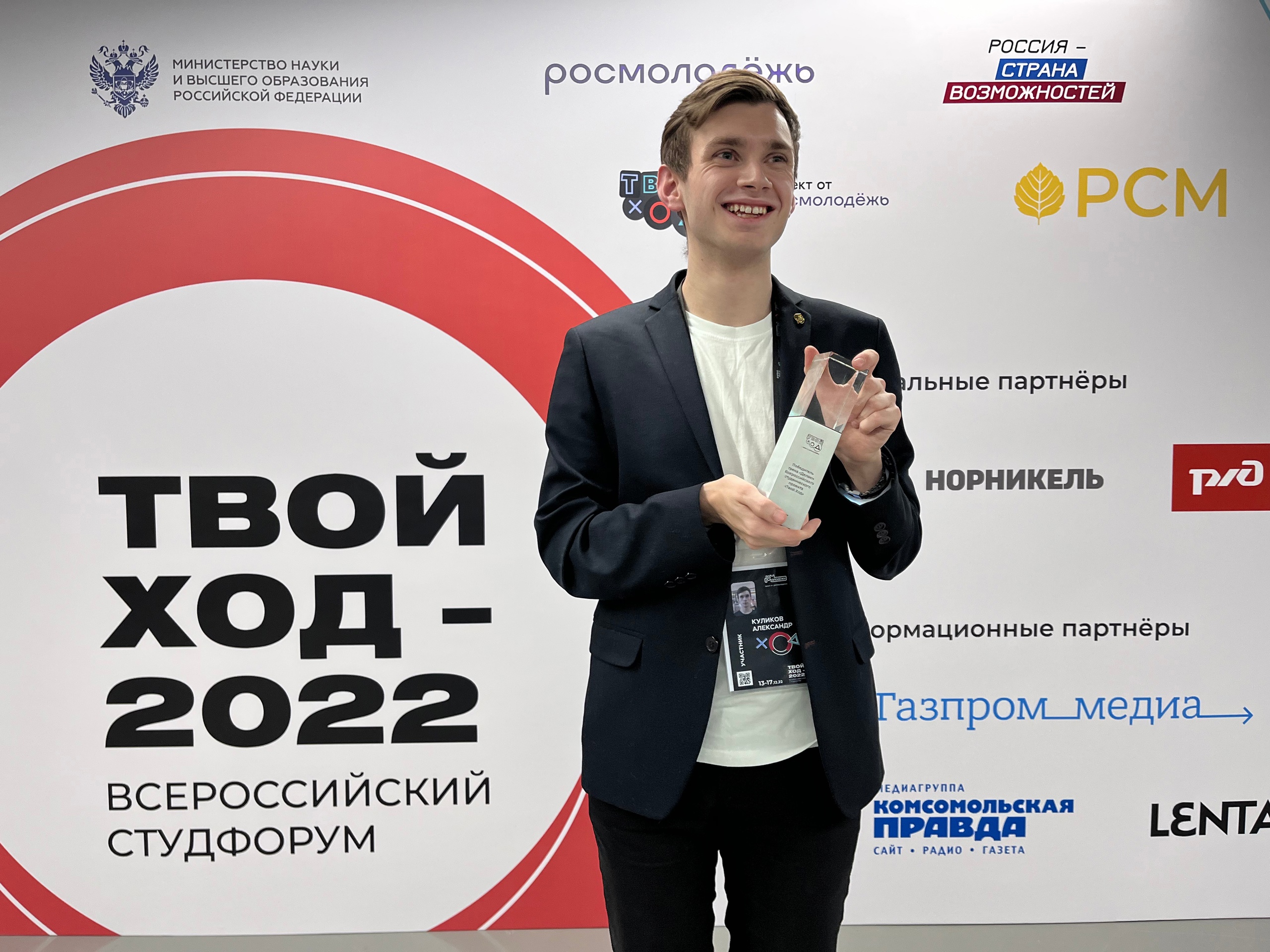 Александр Куликов, обучающийся 4 курса бакалавриата Университета науки и технологий МИСИС, стал победителем всероссийского конкурса «Твой ход-2022» с проектом «Я — наставник», в котором представил систему наставничества, разработанную в НИТУ МИСИС, и лучшие практики Клуба наставников. «Твой ход» — проект для студентов президентской платформы «Россия — страна возможностей», которые хотят самореализоваться через реальные проекты и оказать влияние на опыт других студентов в рамках обучения в вузе. Всего на конкурс было подано более 2 500 заявок, победителями стали 200 обучающихся из всех субъектов Российской Федерации.