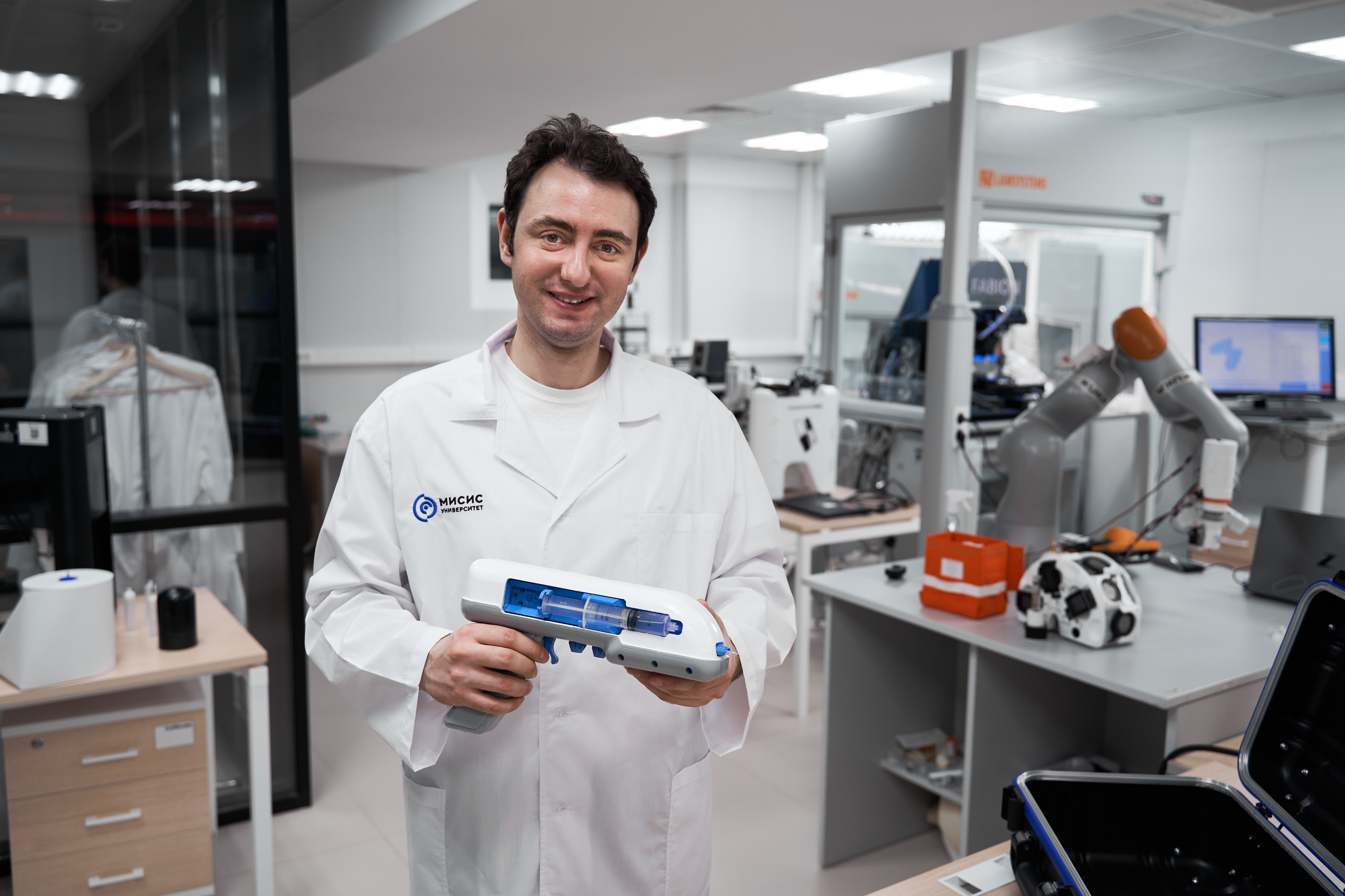 «В отличие от существующих мировых аналогов разработанное устройство является полностью автономным и питается от встроенных аккумуляторных батарей, которые могут быть заряжены через USB-порт, — рассказывает автор разработки Тимур Айдемир, к.т.н., инженер лаборатории тканевой инженерии и регенеративной медицины НИТУ МИСИС. — Перед работой два стандартных шприца объемом 20 мл заправляются биополимерами и медицинскими препаратами. Через специальный порт подсоединяется третий шприц и выполняется заправка устройства сшивающим агентом, далее заправляющий шприц отключается. При нажатии на курок ультразвуковая система одномоментно собирает все компоненты в области печати, тем самым формируя полимерный сшитый биоматериал, способный останавливать кровотечение и ускорять регенерацию ткани».