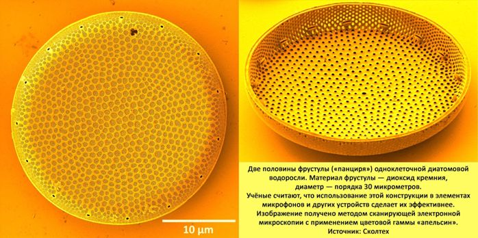 Российские учёные опубликовали свежие результаты исследования диатомовых водорослей — одноклеточного организма с поразительными свойствами, который может стать прообразом ряда прорывных технологических решений. По образу и подобию стеклянного пористого панциря диатомей можно сконструировать мембрану для миниатюрного сверхчувствительного и энергосберегающего микрофона или фотонный кристалл — так называется ключевая составляющая быстрых и энергоэффективных оптоэлектронных микросхем будущего. Целый ряд механических характеристик экзоскелета диатомеи впервые опубликованы в исследовании группы авторов из Сколтеха, НИТУ МИСИС и Оксфорда в журнале Scientific Reports.