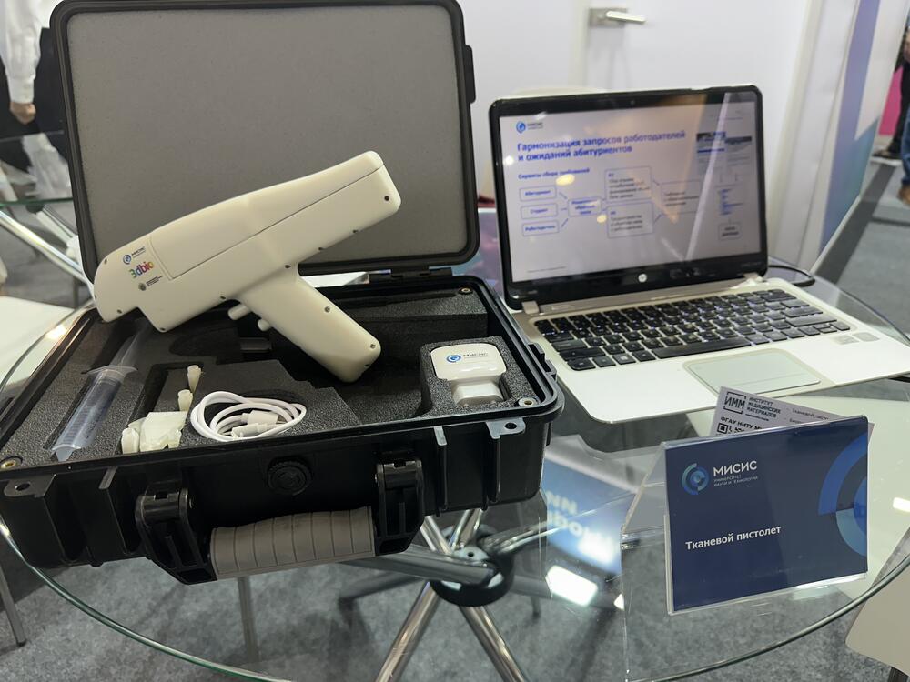Тканевой пистолет. Может останавливать кровотечения и запускать регенеративные процессы при ранениях легкой и средней степени тяжести. Устройство предназначено для работы в военно-полевых условиях и в зоне ЧС. Барьерный эффект на поврежденной коже создается за счет параллельной двухкомпонентной высокоточной подачи обезболивающих, кровоостанавливающих, антибактериальных и других веществ на рану. При сшивке биоактивный материал создает пленку, предотвращая попадание бактериальной инфекции и создавая благоприятные условия для ее ускоренного заживления.