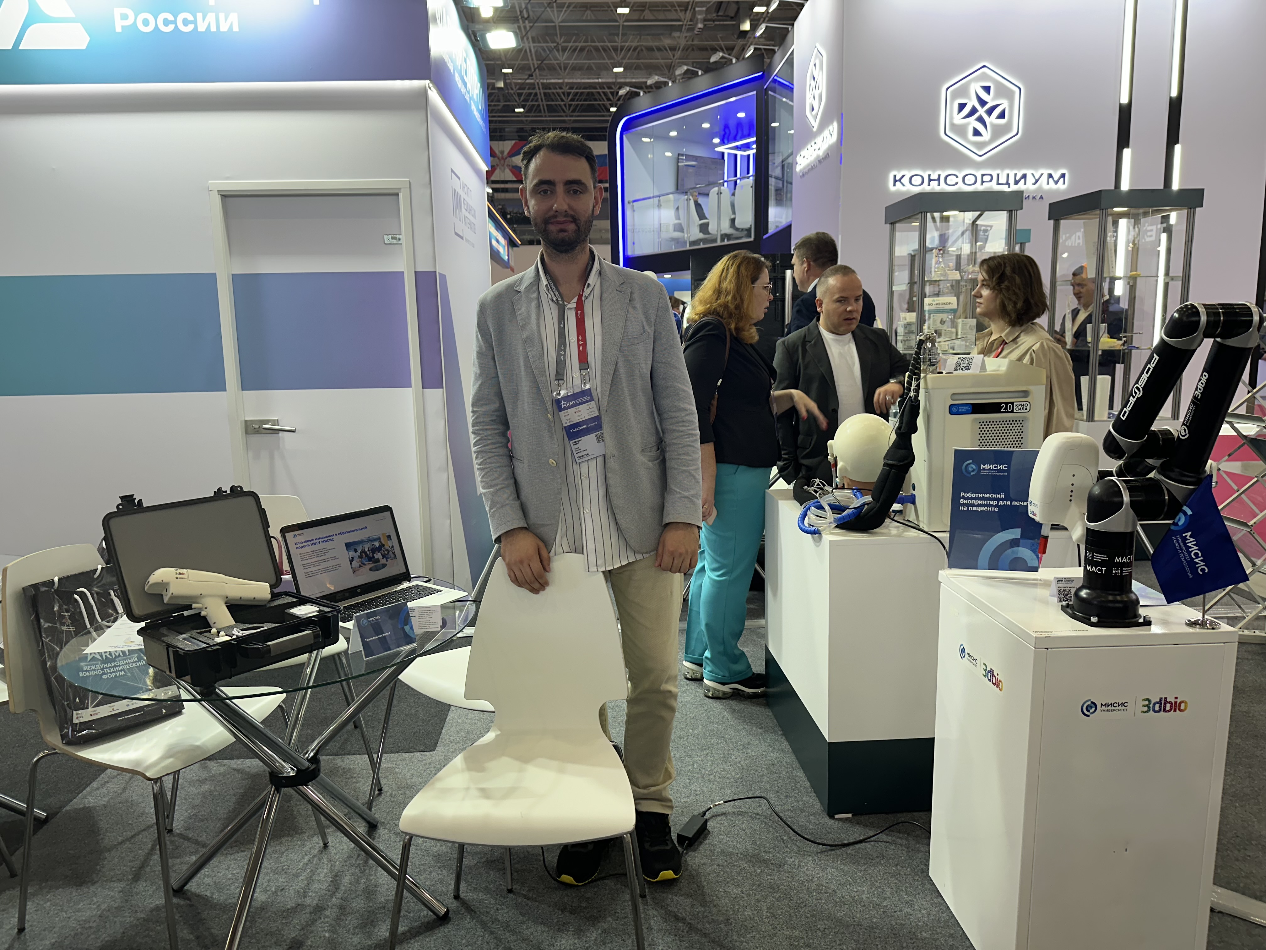Роботический биопринтер для печати на пациенте. Может использоваться для лечения ожогов, язв и обширных повреждений мягких тканей. Устройство сканирует дефект, создает его трехмерную модель, а затем заполняет участок гидрогелевой композицией с живыми клетками. Метод эффективен при лечении ран со сложной геометрией. Движения роборуки и подача материала происходят по траектории, которую генерирует программа. Она учитывает не только изгибы тела, но даже дыхание пациента. В декабре 2023 года с применением биопринтера была проведена первая в мире операция на человеке. В разработке принимали участие магистранты передовой инженерной школы НИТУ МИСИС «Материаловедение, аддитивные и сквозные технологии» (ПИШ МАСТ).