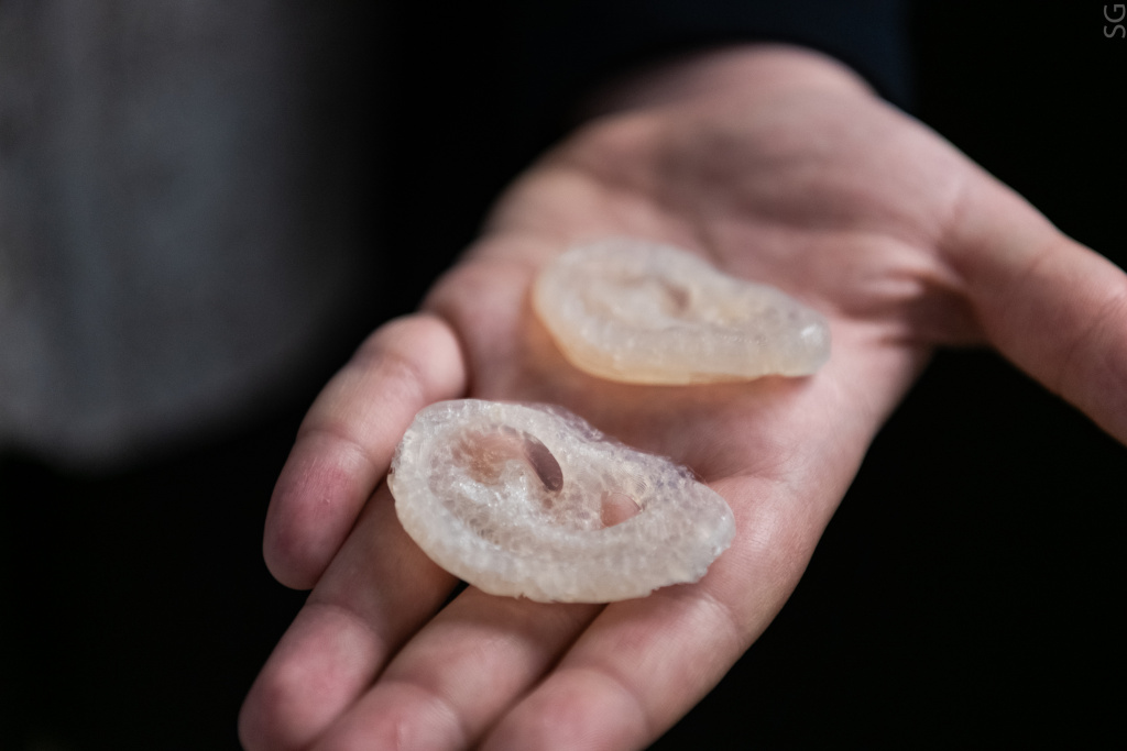 Протезы синтезируются из двух функциональных составляющих — пористого 3D-печатного каркаса и агарового гидрогеля в качестве наполнителя, сшитого феруловой кислотой. Гироидная структура полиуретанового каркаса способствует прорастанию сосудов, а интегрированные ребра жесткости обеспечивают сохранение формы под действием силы натяжения кожных лоскутов, что приближает имплантат к естественным ушным раковинам по биофизическим характеристикам. Использование аддитивных технологий также помогает решать задачу точного воссоздания формы и рельефа ушных раковин индивидуальных пациентов.