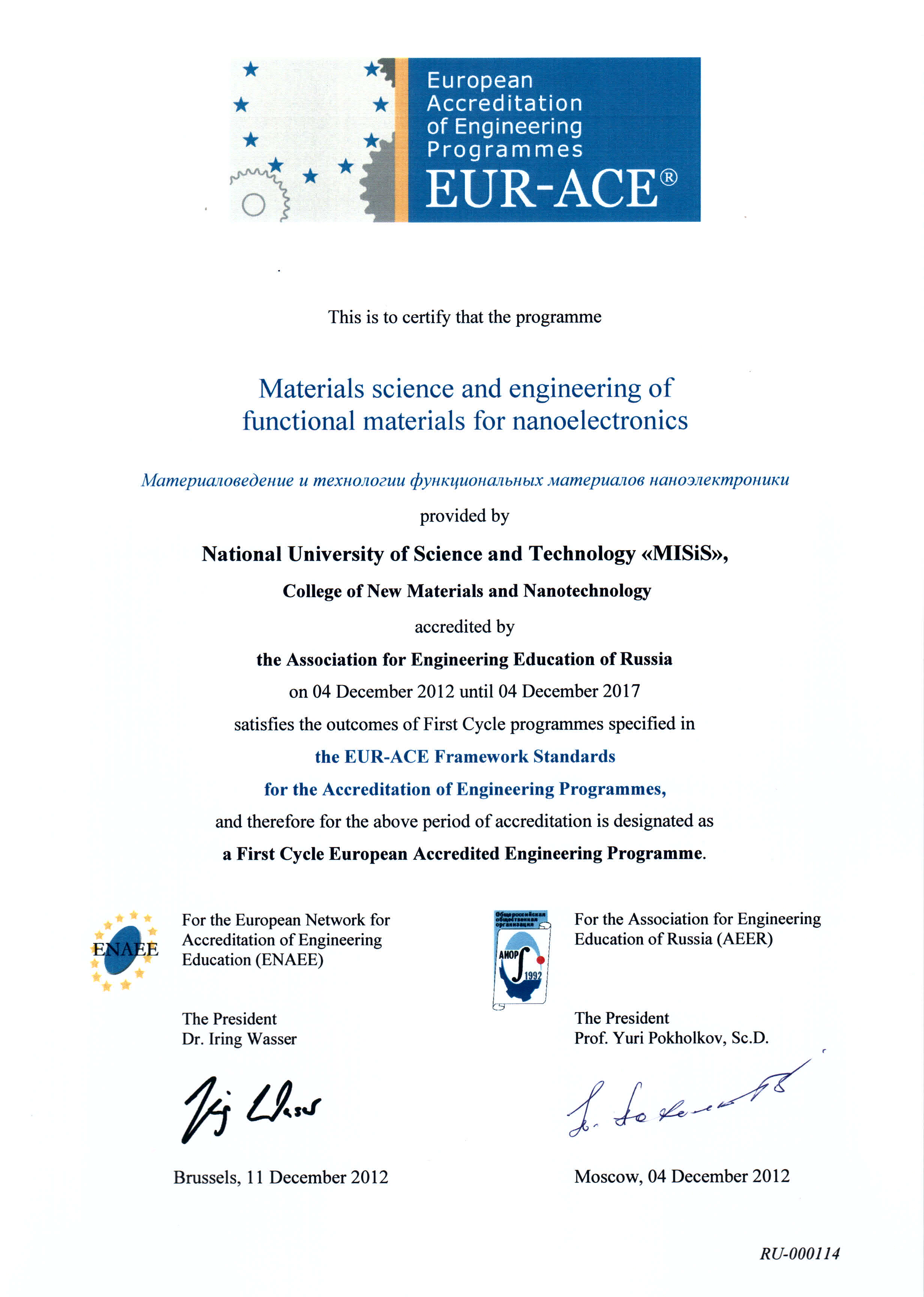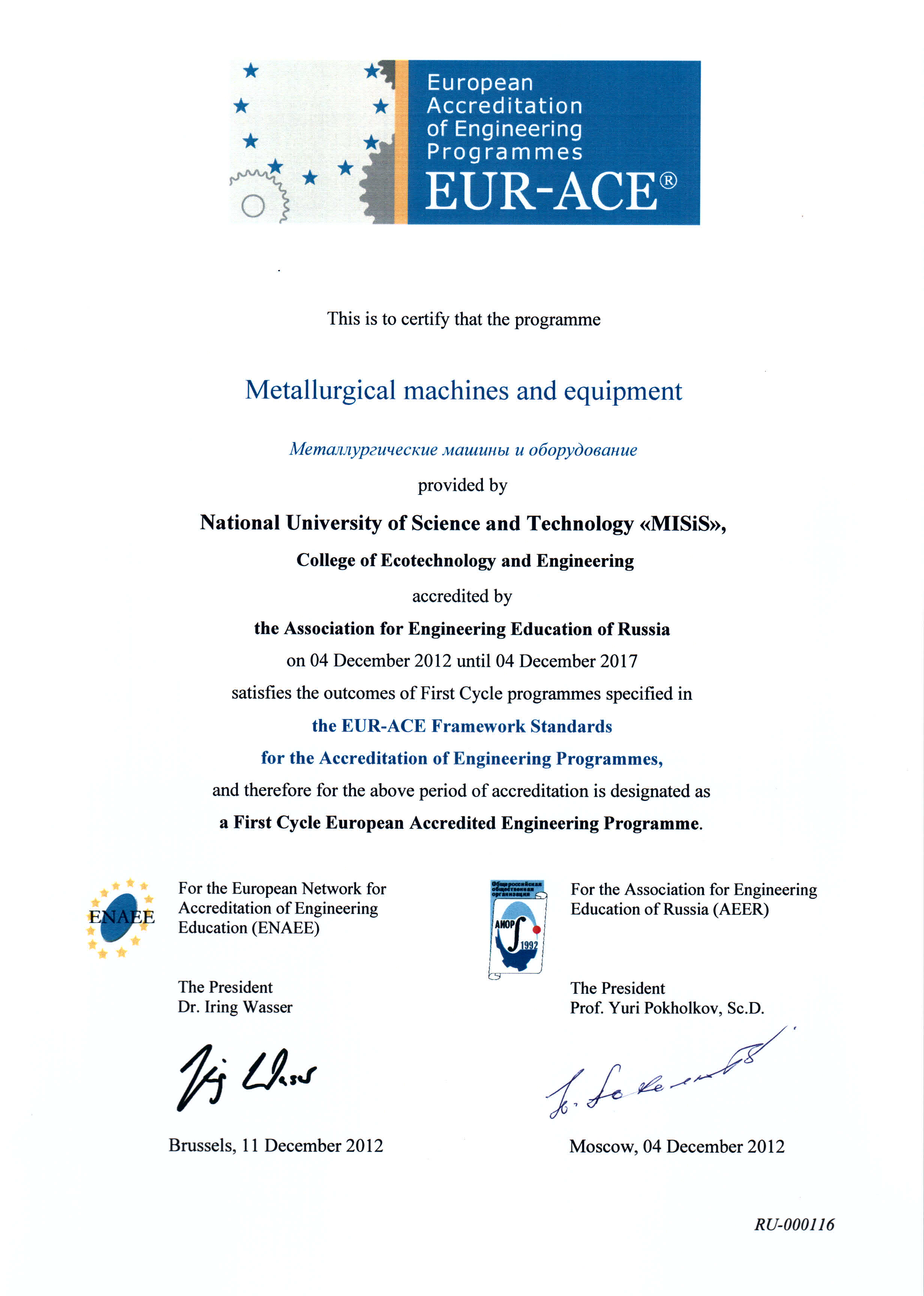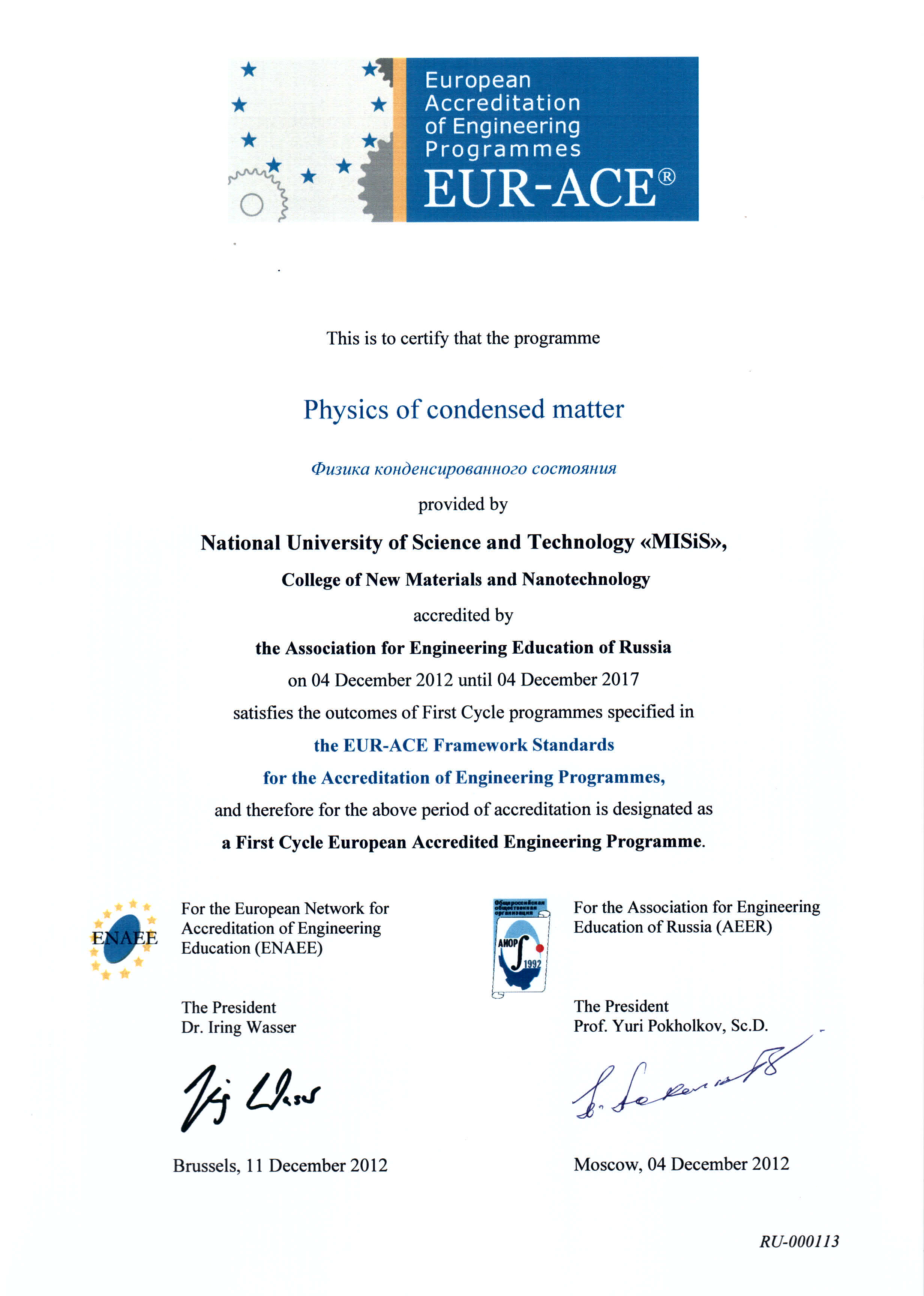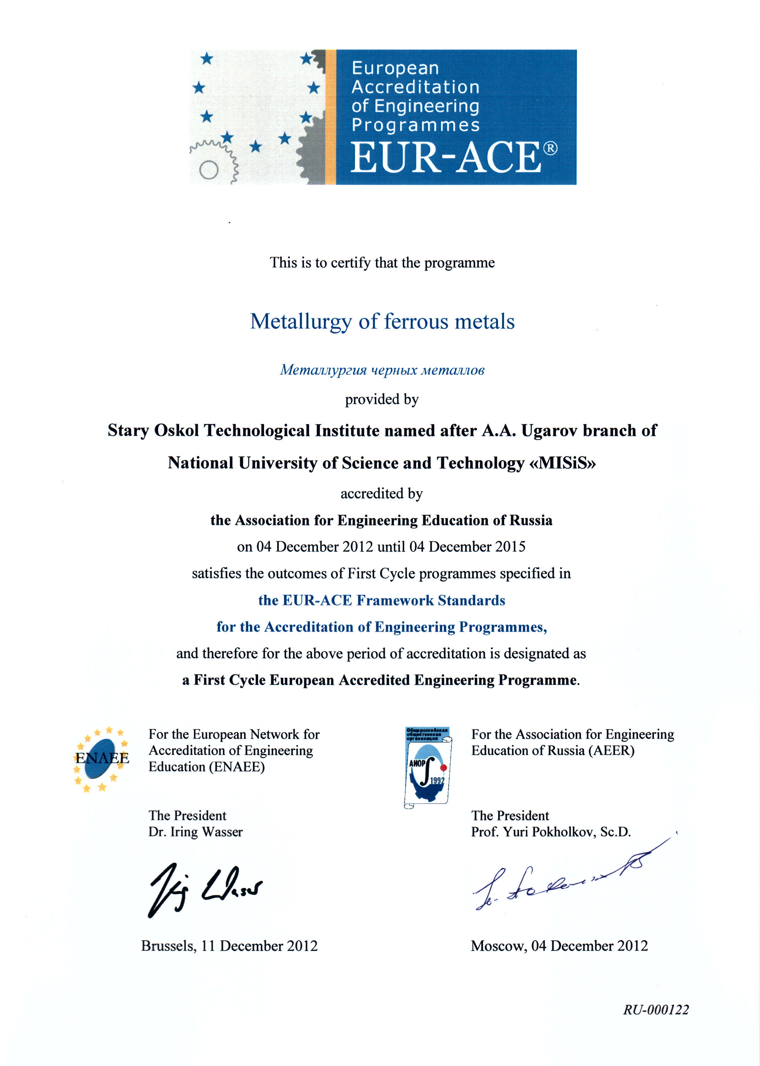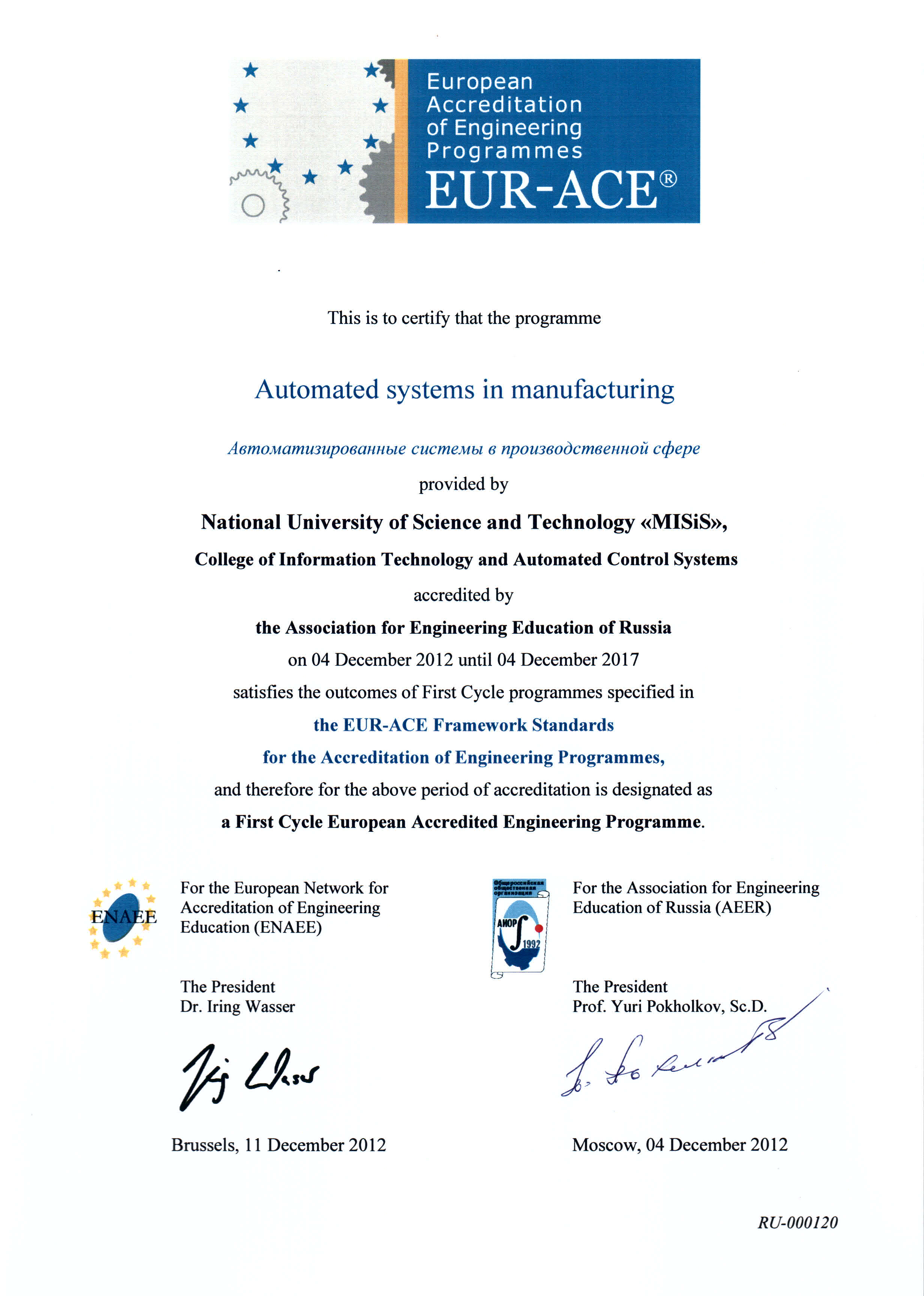 - Сертификат Европейской сети по аккредитации в области инженерного образования (ENAEE) о присвоении «Европейского знака качества» (EUR-ACE® label) от 04.12.2012 г. № RU-000120