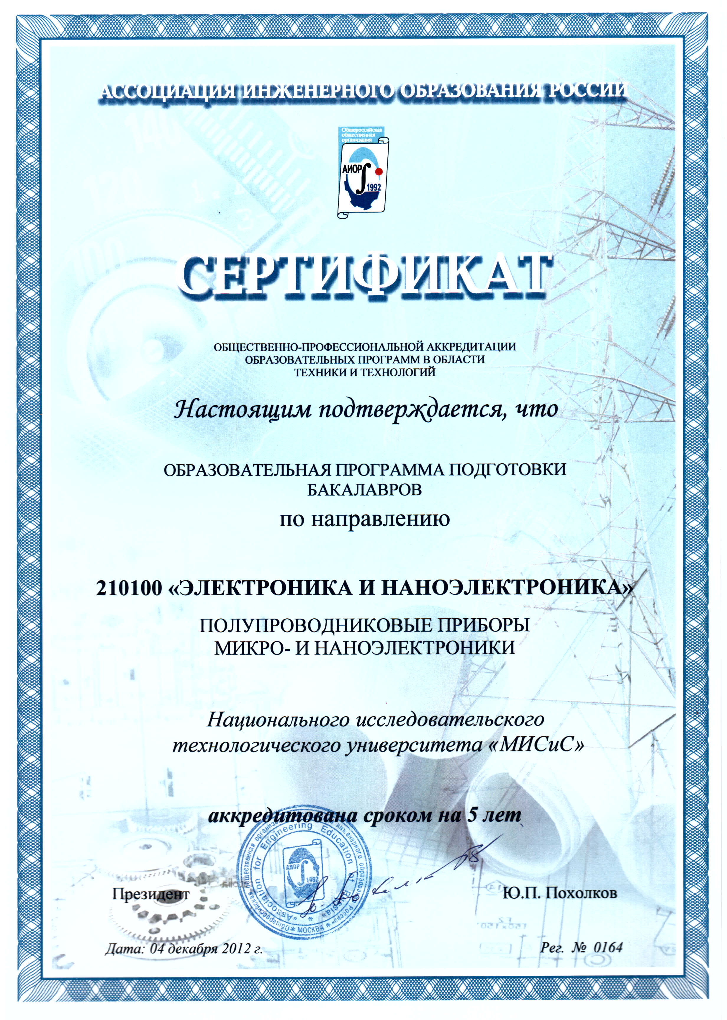 - Сертификат АИОР о прохождении общественно-профессиональной аккредитации образовательных программ в области техники и технологий от 04.12.2012 г. рег. № 0164