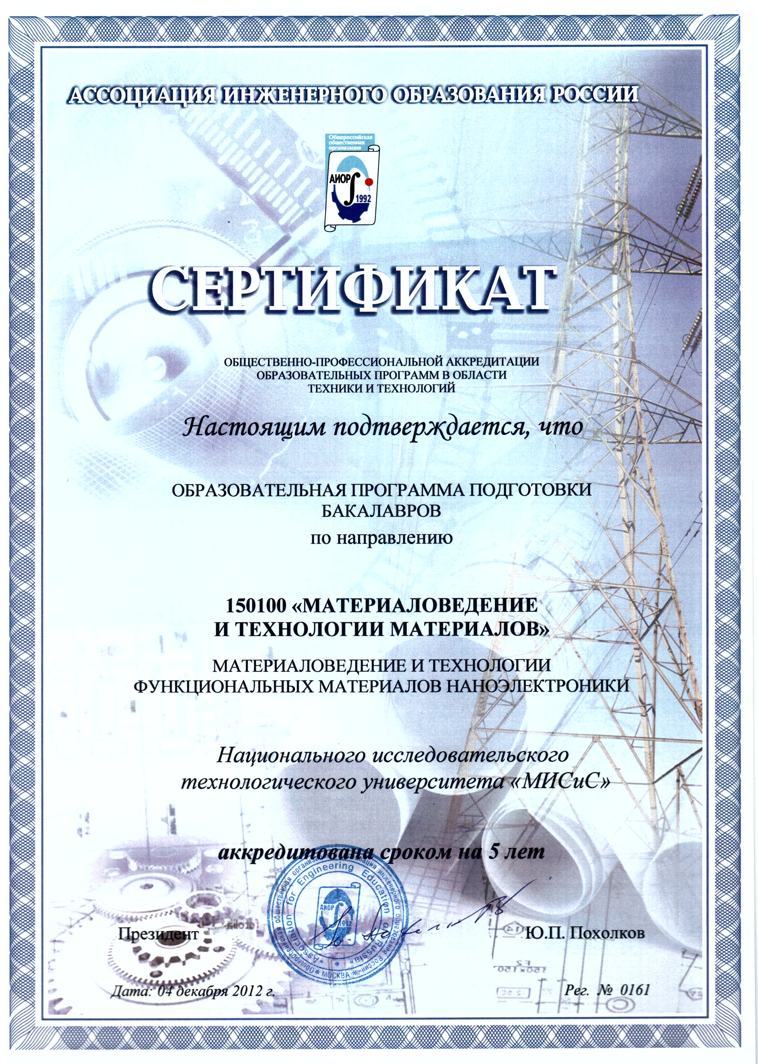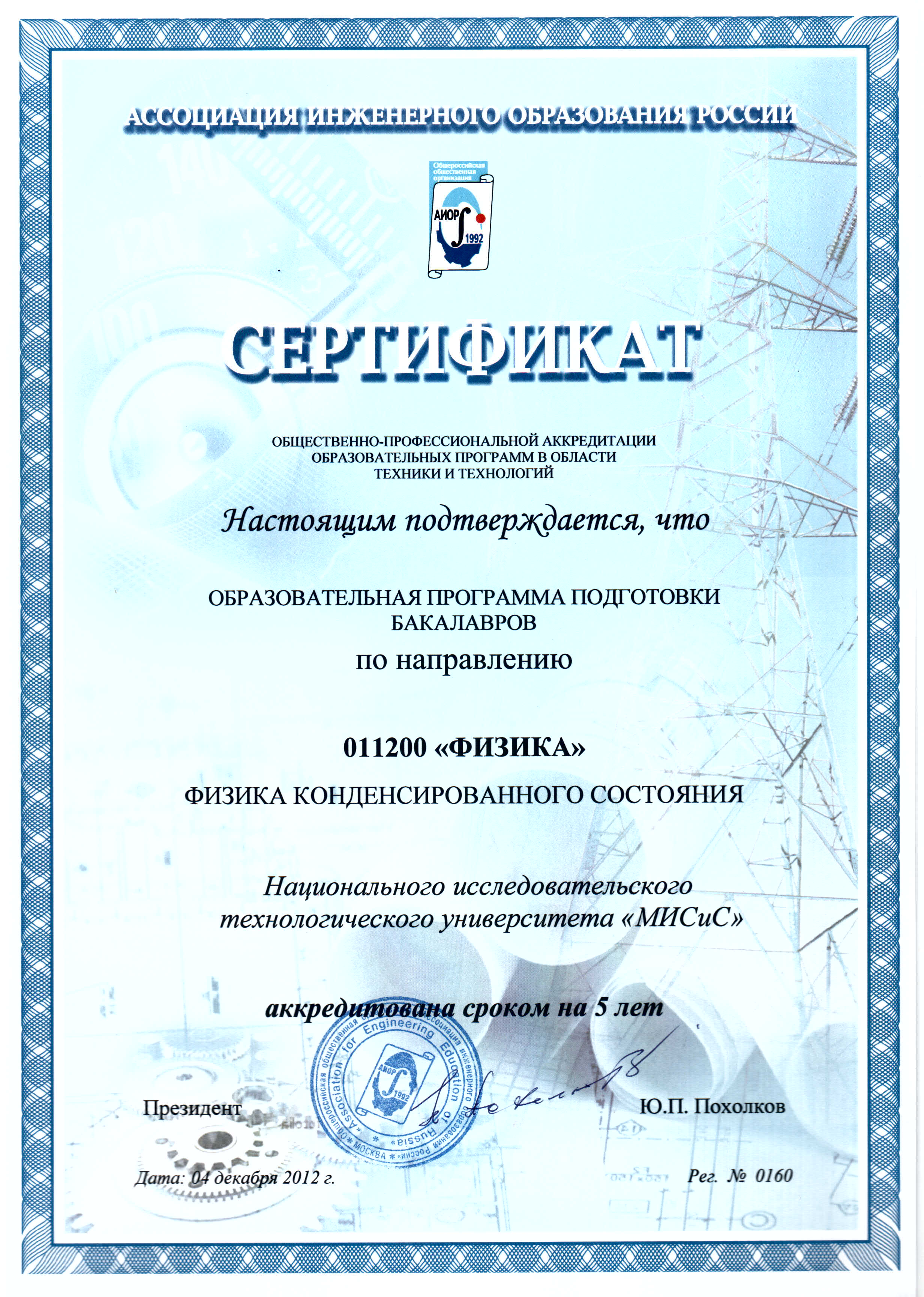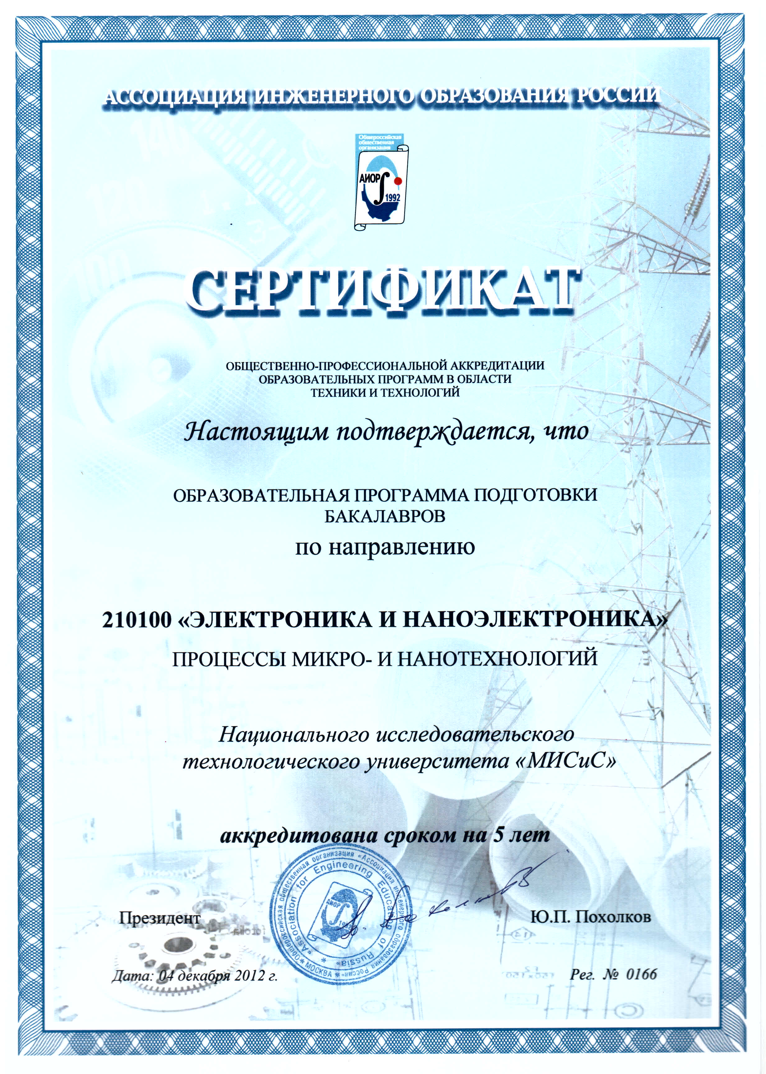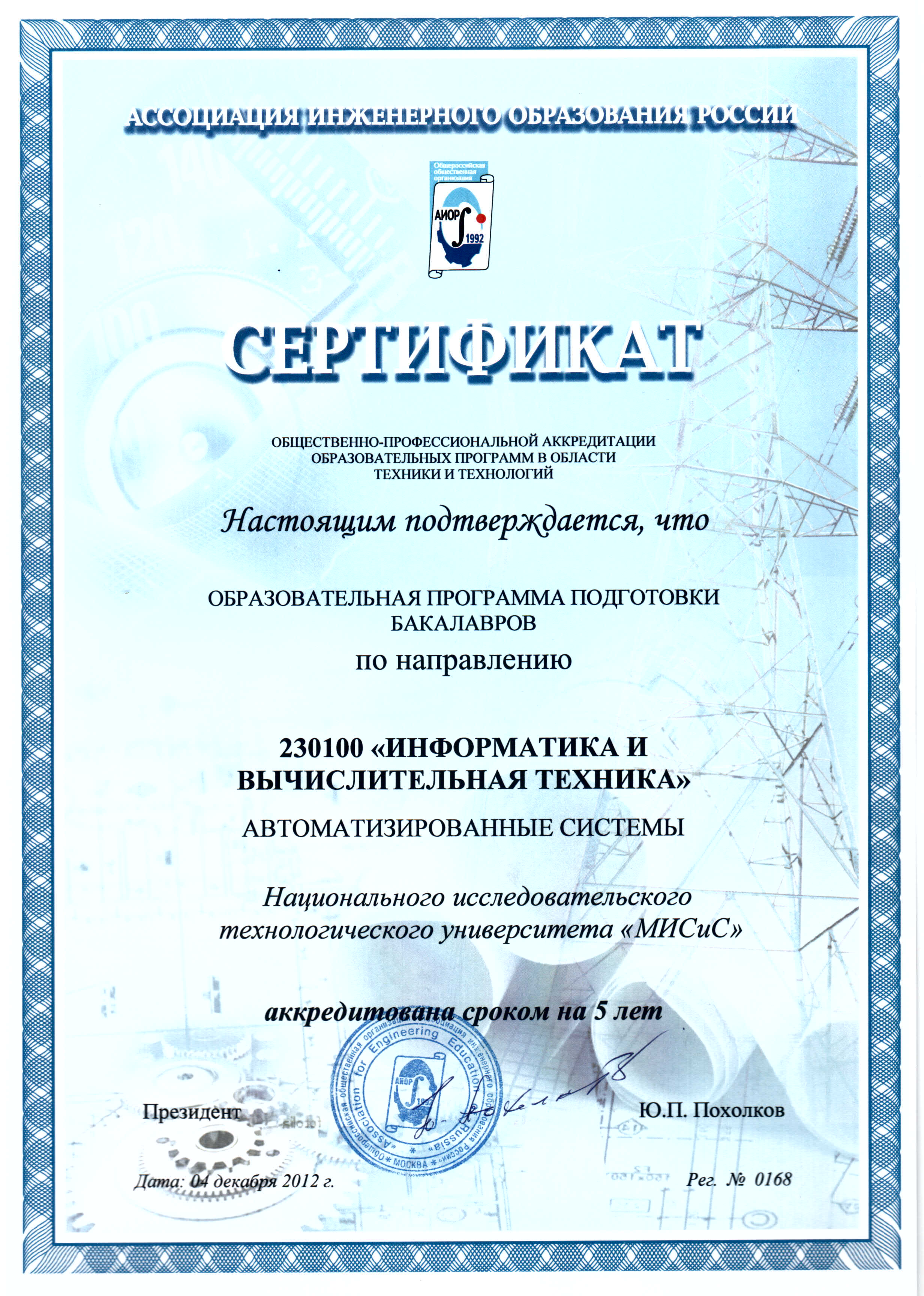 - Сертификат АИОР о прохождении общественно-профессиональной аккредитации образовательных программ в области техники и технологий от 04.12.2012 г. рег. № 0162