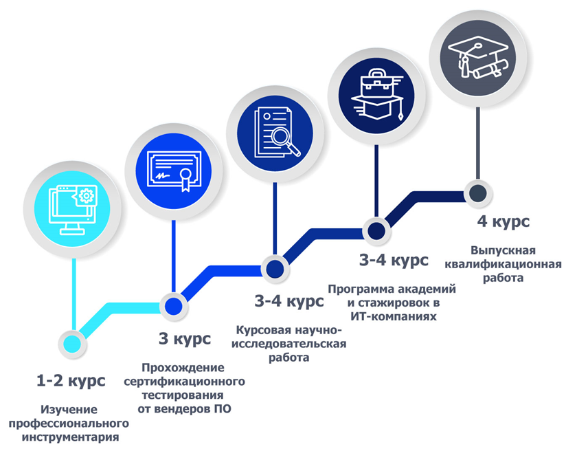 На 1 и 2 курсах студенты осваивают основы методологии проектирования информационных систем, а также приобретают базовые навыки работы в различных программных продуктах.